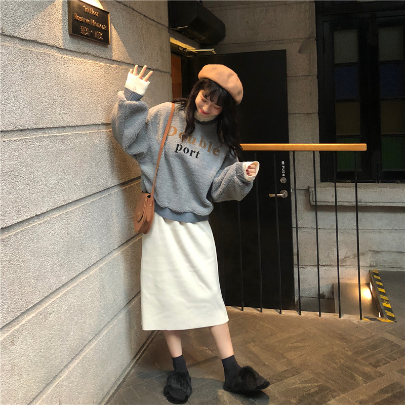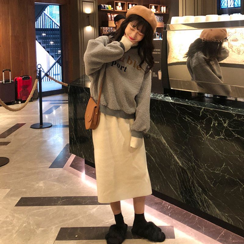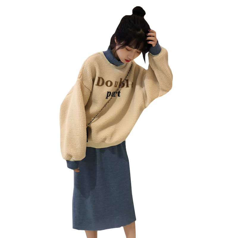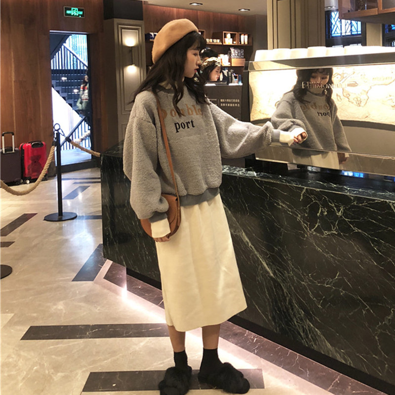 / 韓版時尚休閑套裝秋季毛衣拼接仿羊羔毛加厚衛衣+半身裙兩件套女