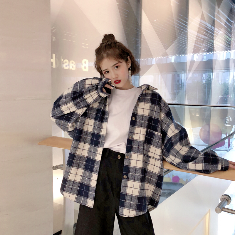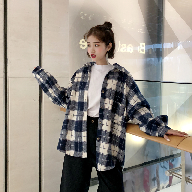 2018新款秋冬韓版中長款復古格子翻領襯衣寬松休閑襯衫上衣外套女