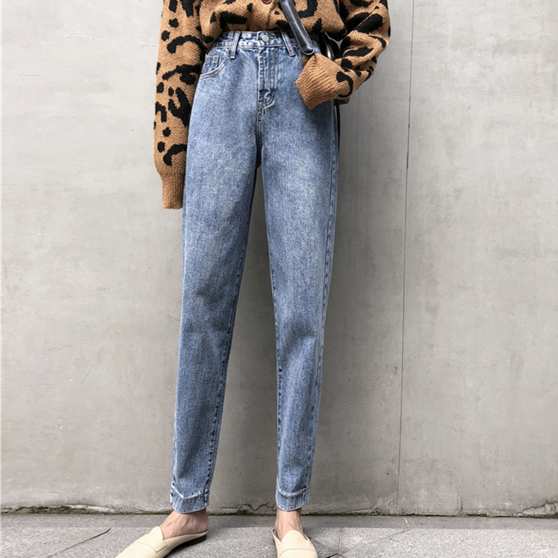 韓版白色牛仔褲女chic寬松高腰哈倫直筒褲秋裝新款學生休閑長褲子