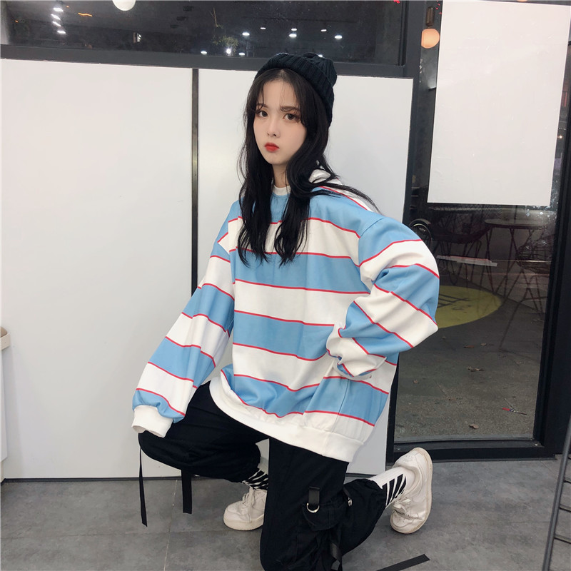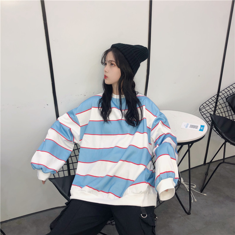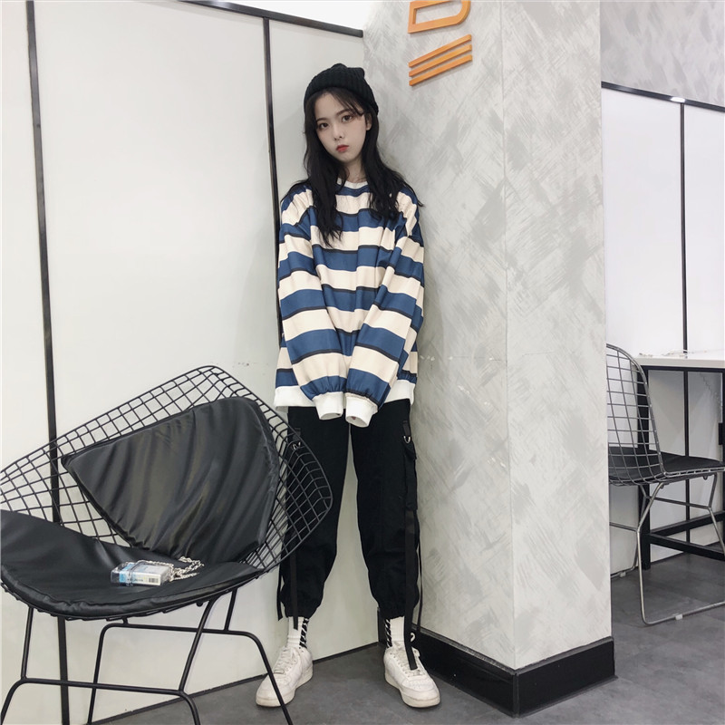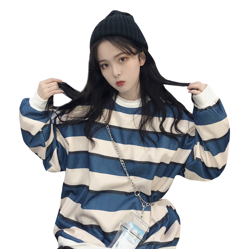 / 2018新款秋冬女裝韓版中長款學院風厚實寬松條紋呢料衛衣上衣外套