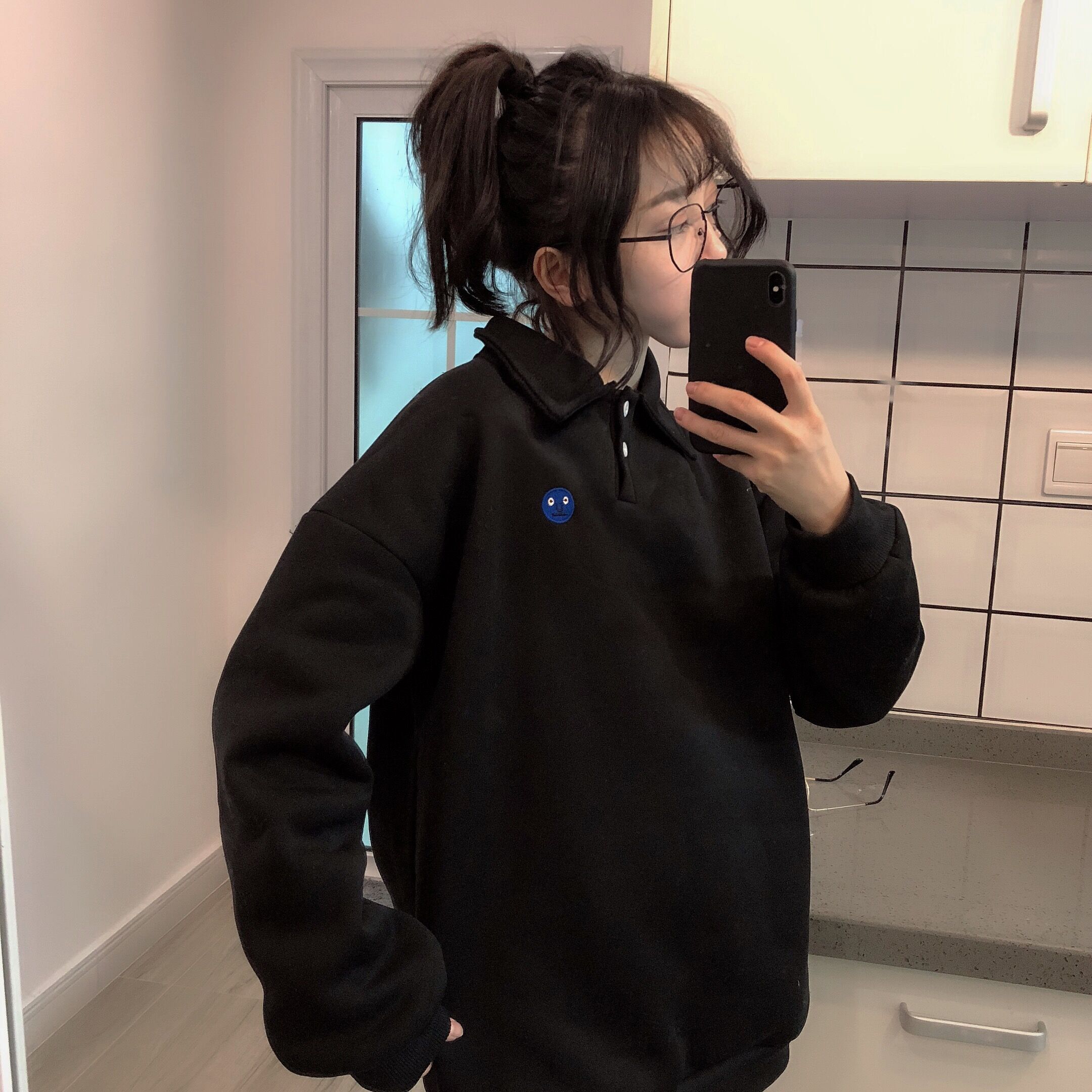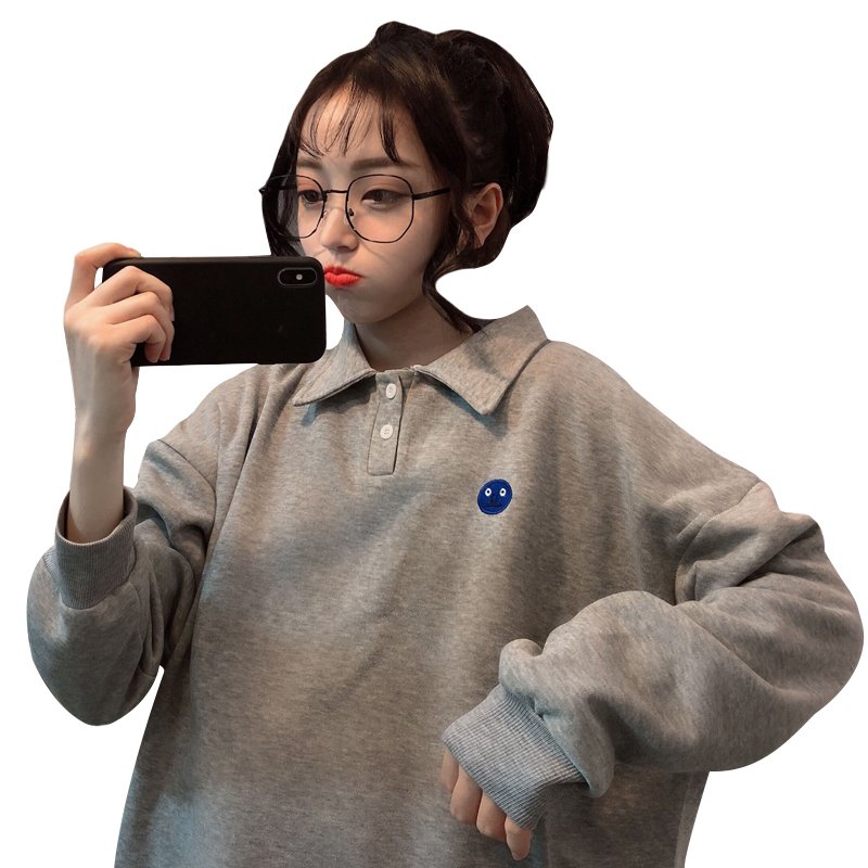 / 秋冬女裝韓版學院風寬松polo領卡通刺繡加絨加厚套頭衛衣上衣外套
