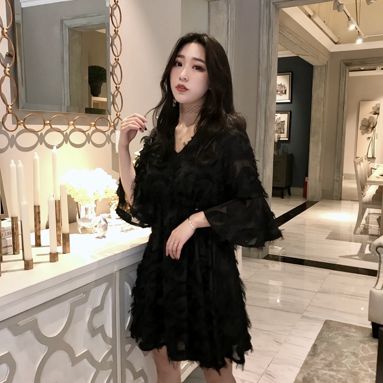 / 韓國超仙V領雪紡流蘇寬松顯瘦氣質a字娃娃裙chic小清新洋氣連衣裙