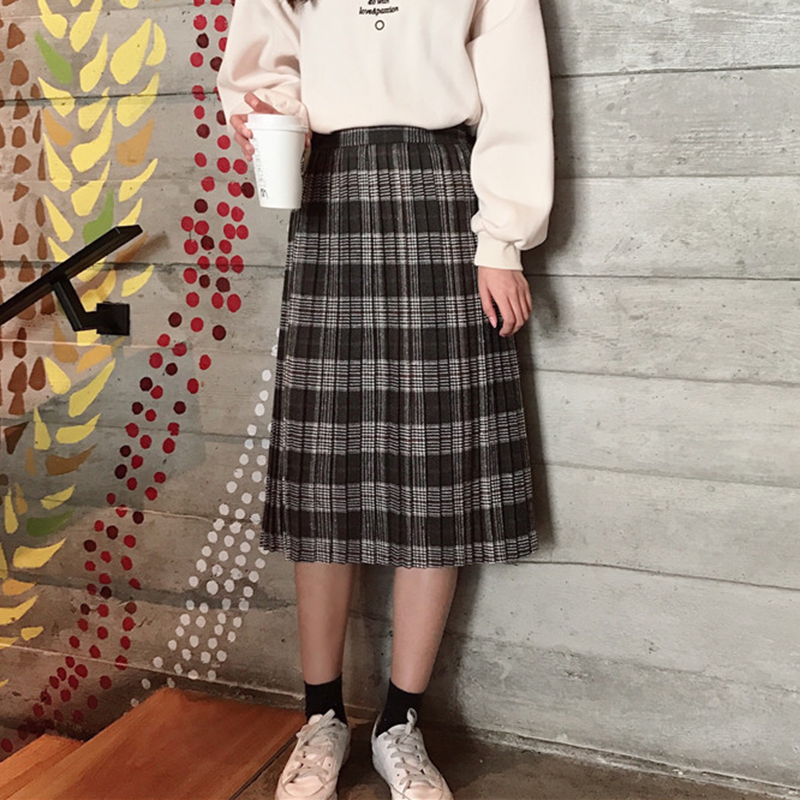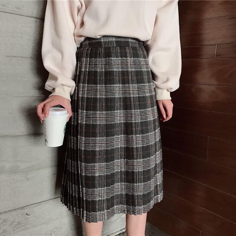 / 半身A字裙女秋冬裝2018新款韓版氣質高腰顯瘦毛呢格子壓褶中長裙