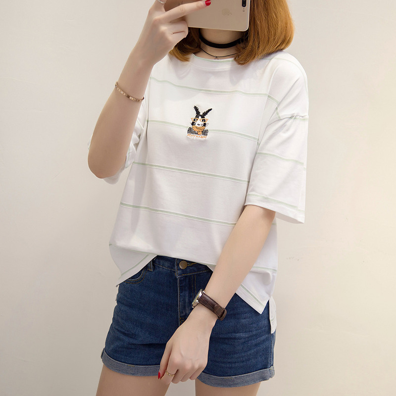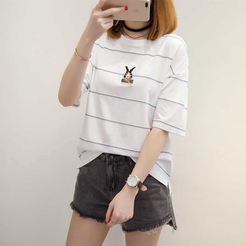 白色條紋t恤女小清新心機上衣刺繡韓版體恤衫短袖衣服女夏裝