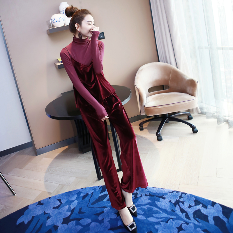 / 復古洋氣網紅絲絨三件套裝長袖上衣吊帶長褲闊腿褲秋裝女2018新款