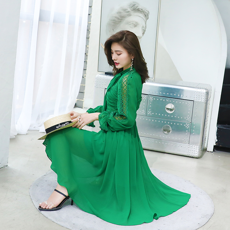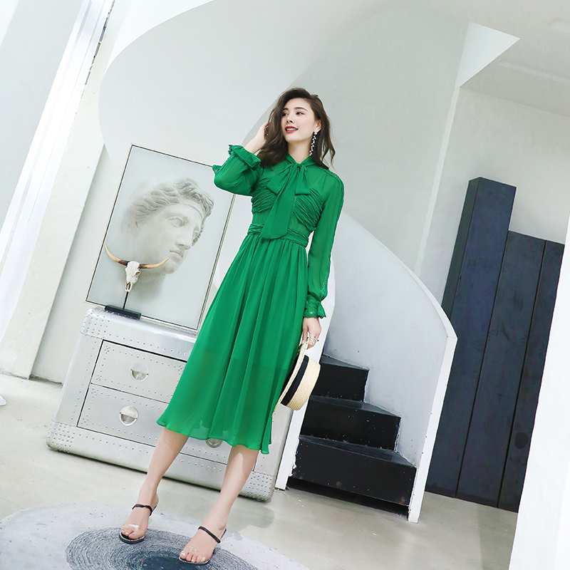 / 雪紡收腰長袖襯衫連衣裙2018新款秋女復古高腰純色甜美蝴蝶結裙子