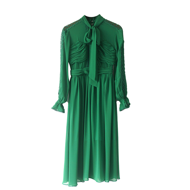 雪紡收腰長袖襯衫連衣裙2018新款秋女復古高腰純色甜美蝴蝶結裙子