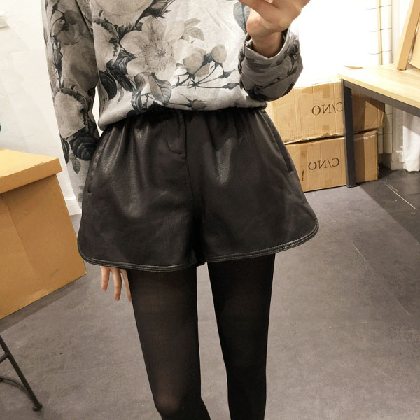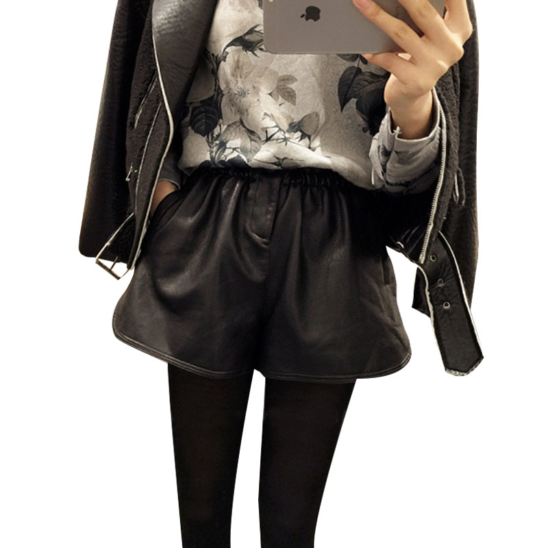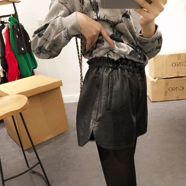 / 秋冬女裝韓版寬松pu皮松緊腰花苞褲闊腿褲外穿短褲皮褲休閑褲顯瘦