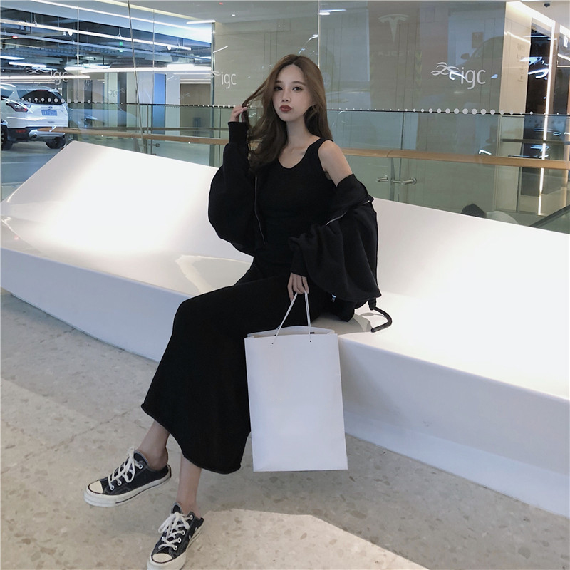 秋裝女2018新款內搭背心+開衫加絨連帽衛衣+針織半身長裙三件套潮