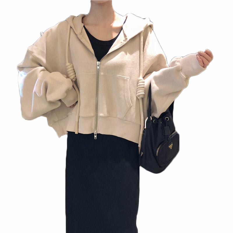 秋裝女2018新款港味抽繩連帽衛衣女潮寬松百搭純色拉鏈長袖外套潮