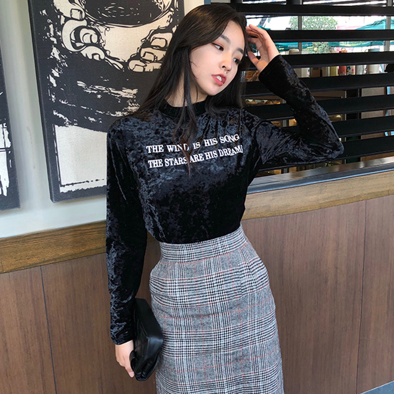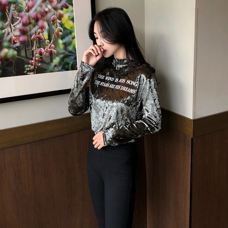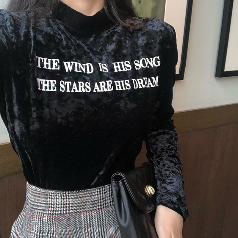 半高領長袖絲絨打底衫女秋冬裝2018新款韓版修身顯瘦字母T恤上衣
