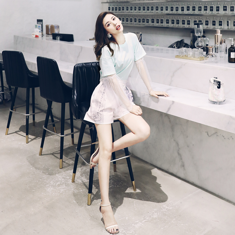 / S秀2018夏季時尚新款女顯瘦修身氣質高腰網紗上衣短褲兩件套裝