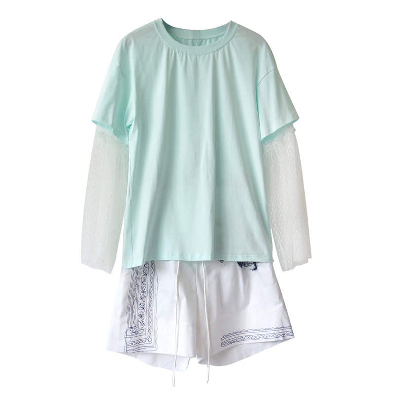 S秀2018夏季時尚新款女顯瘦修身氣質高腰網紗上衣短褲兩件套裝