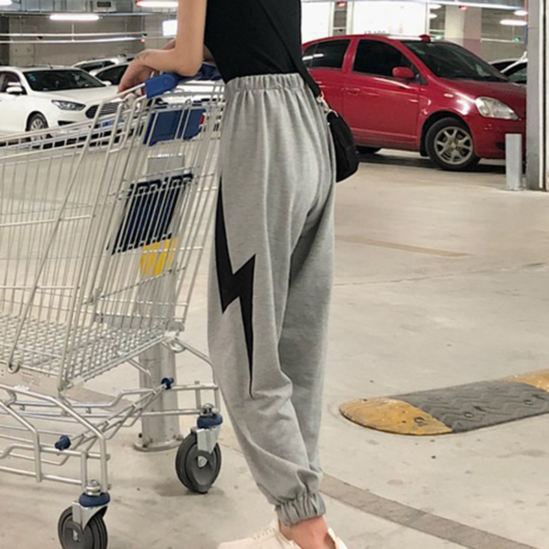休閑褲女夏季新款韓版女裝閃電圖案束腳九分運動褲百搭寬松哈倫褲