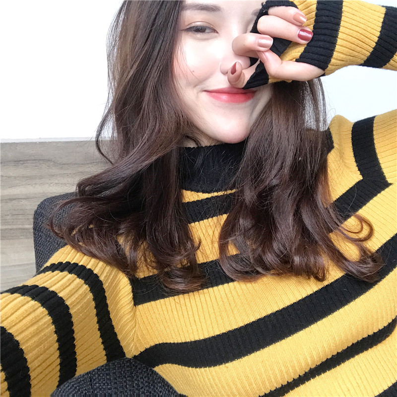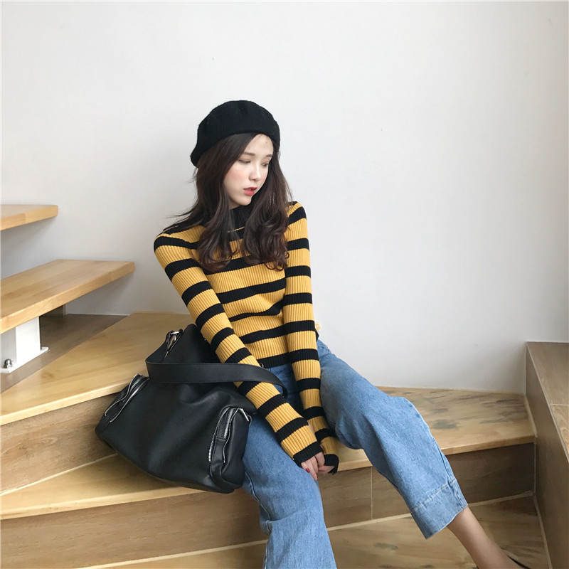 chic風早秋上衣女2018新款韓版時尚顯瘦百搭條紋套手指針織衫毛衣