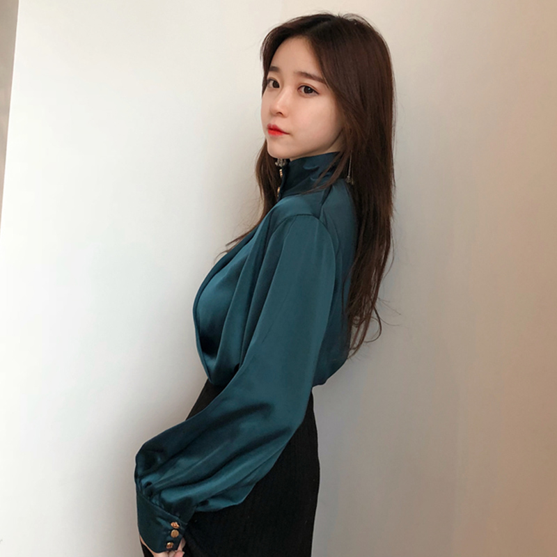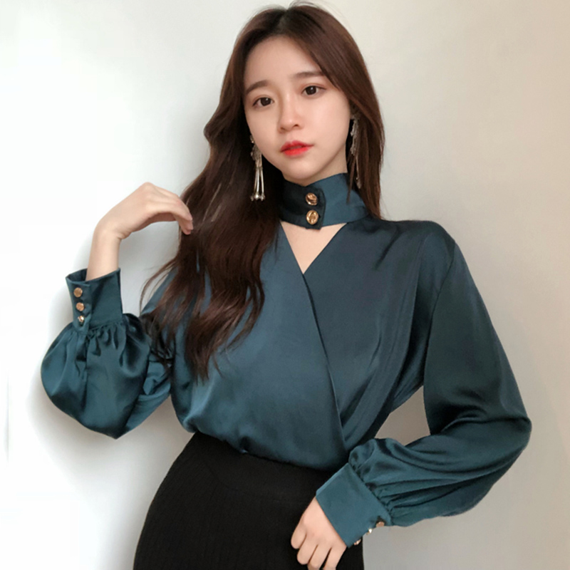 / 溫柔風氣質長袖襯衫女秋裝新款寬松上衣港味復古掛脖V領鏤空襯衣