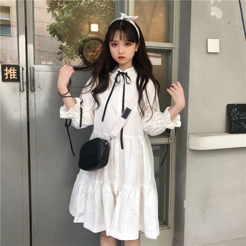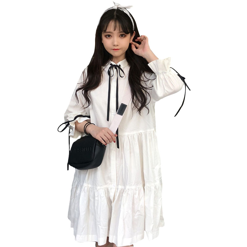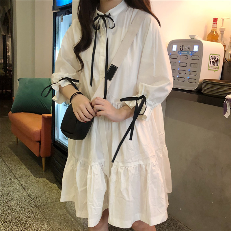 / 夏季女裝韓版中長款白色溫柔氣質小清新Polo領寬松顯瘦系帶連衣裙