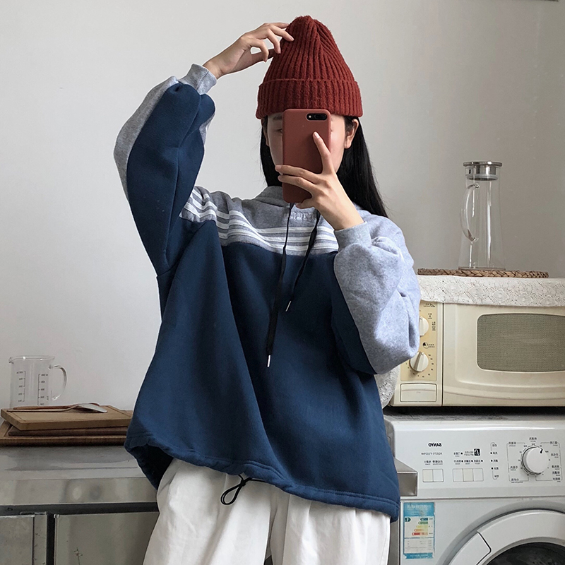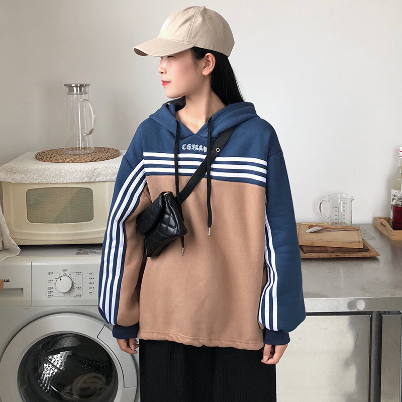 / 撞色拼接連帽衛衣2018新款女秋冬裝港風字母刺繡情侶外套寬松上衣