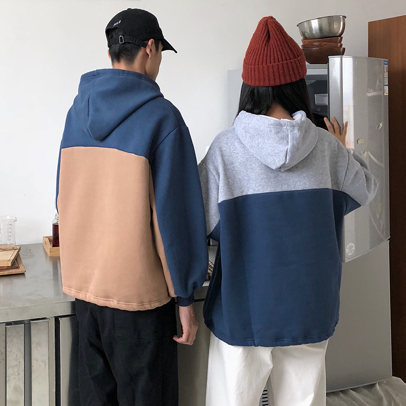 撞色拼接連帽衛衣2018新款女秋冬裝港風字母刺繡情侶外套寬松上衣
