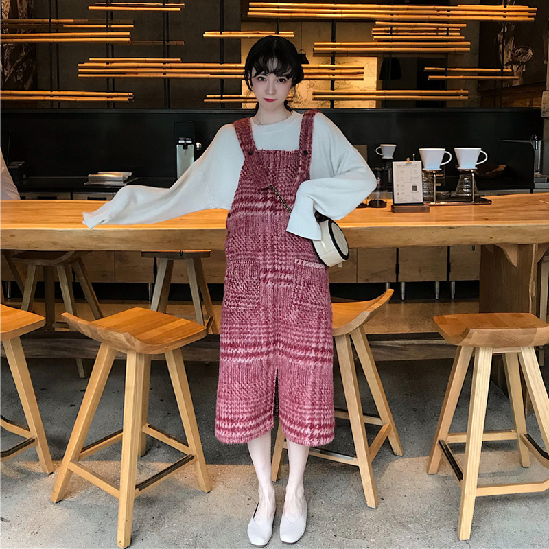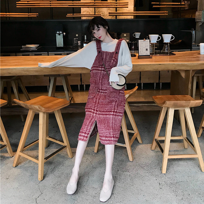 韓版時尚套裝慵懶寬松套頭開叉針織衫+氣質中長款格紋毛呢背帶裙