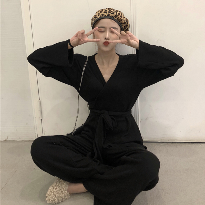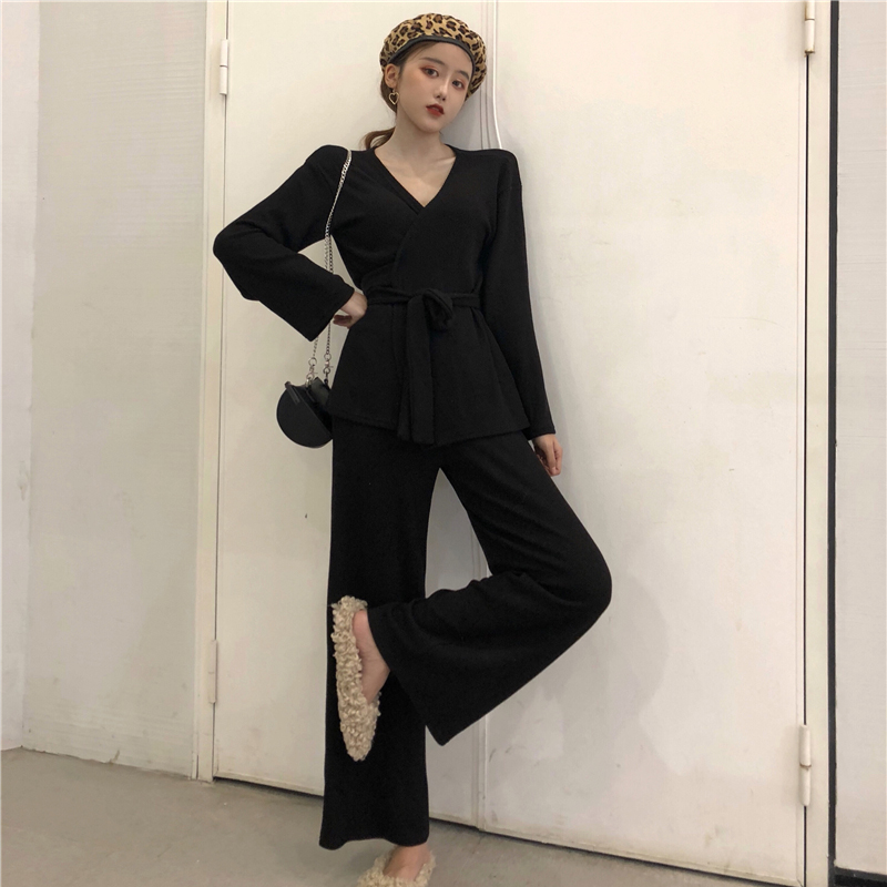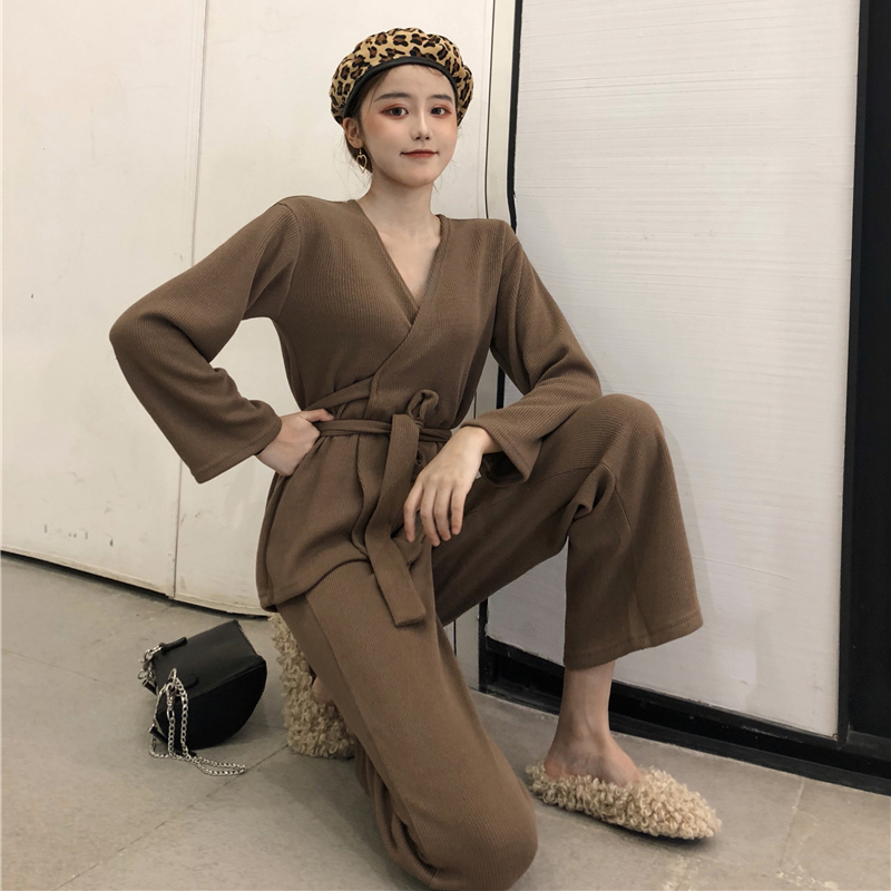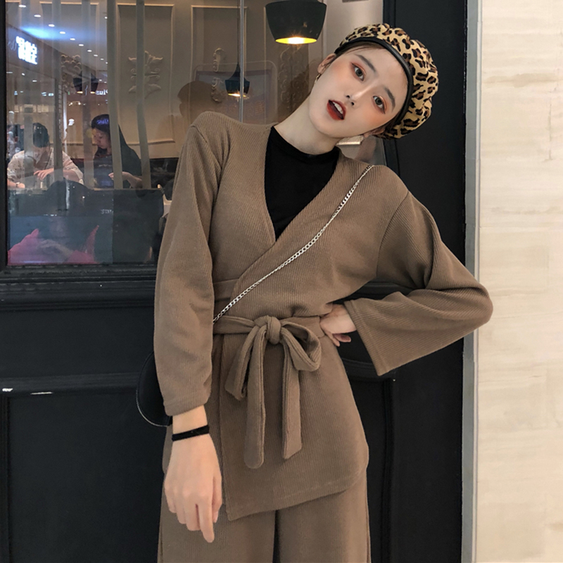 / 套裝女秋新款系帶長袖針織開衫高腰顯瘦休閑寬松闊腿長褲子兩件套