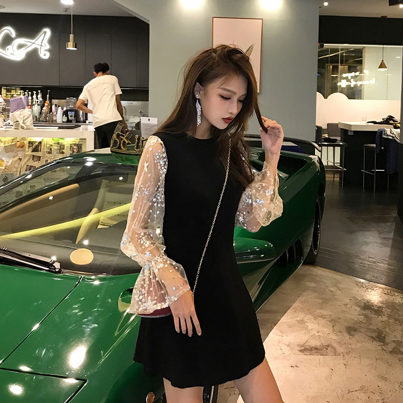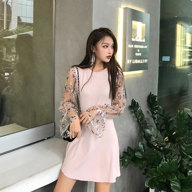 2018網紅針織亮片網紗拼接連衣裙女長袖早秋新款A字打底裙中長款