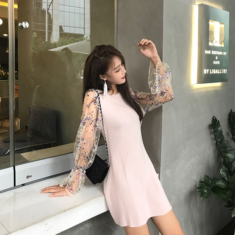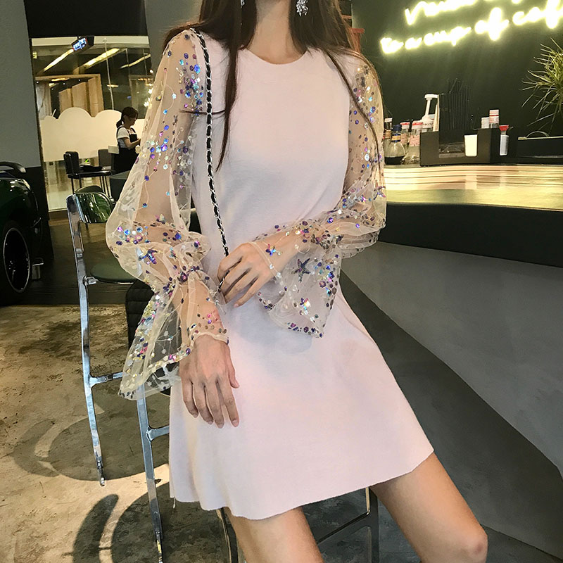 / 2018網紅針織亮片網紗拼接連衣裙女長袖早秋新款A字打底裙中長款