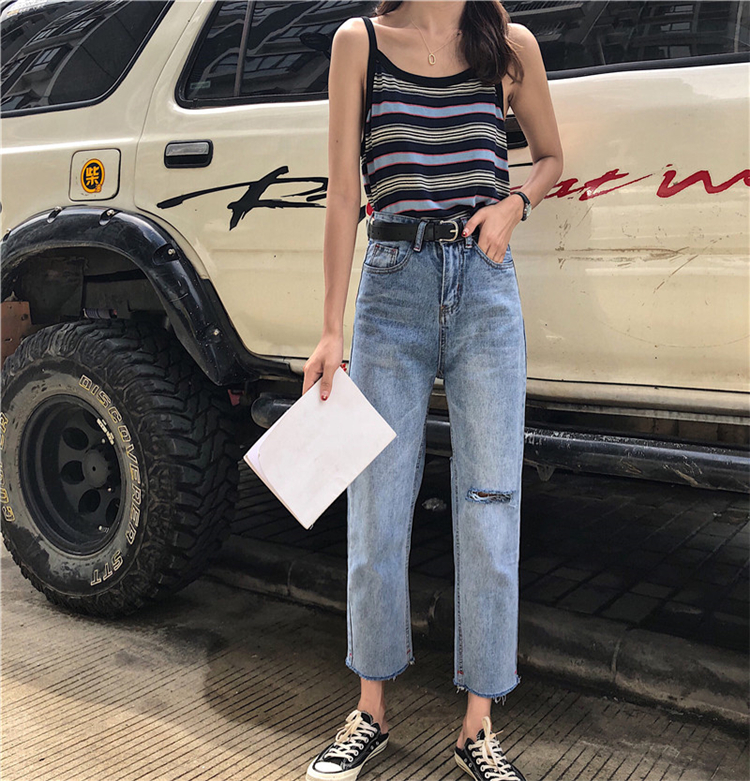 / 秋裝女裝韓版寬松BF風高腰顯瘦水洗破洞牛仔褲學生九分褲直筒褲潮