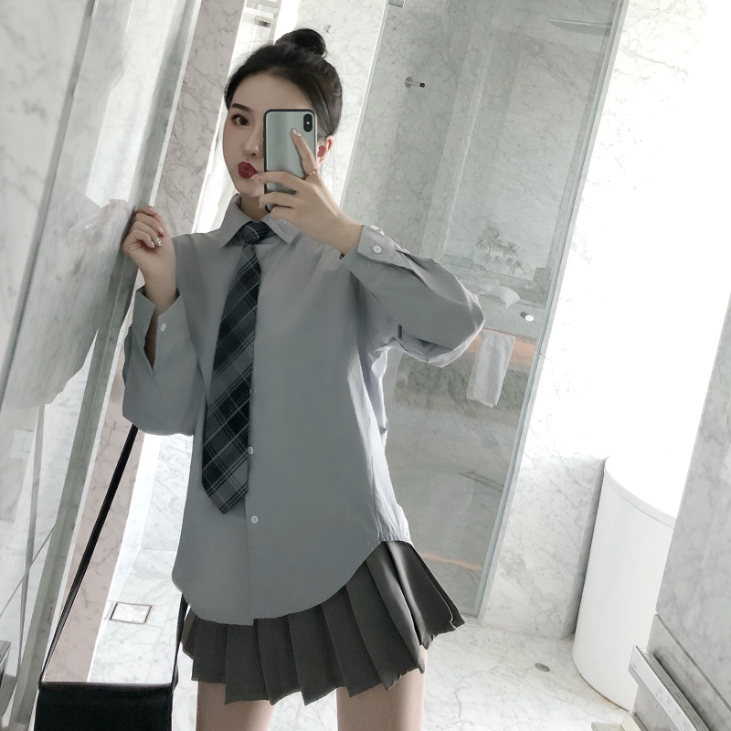 韓國學院風寬松長袖襯衫+格紋領帶+百褶高腰半身裙時尚套裝分開拍