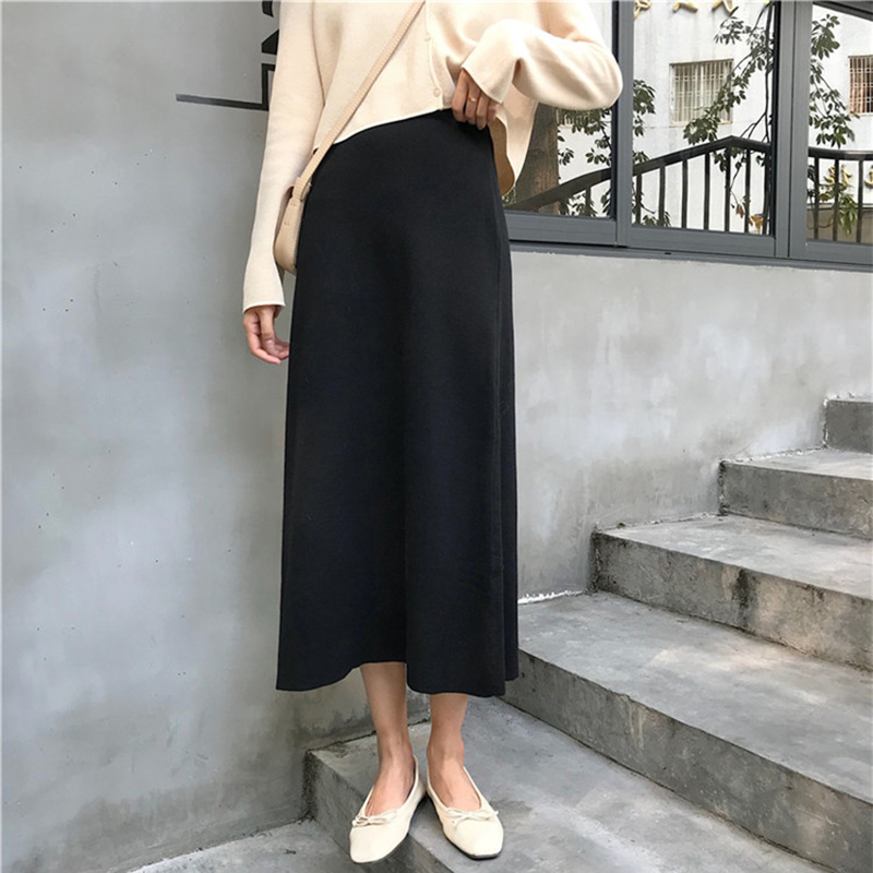 復古黑色中長針織裙秋裝女2018新款韓版高腰顯瘦A字裙氣質半身裙