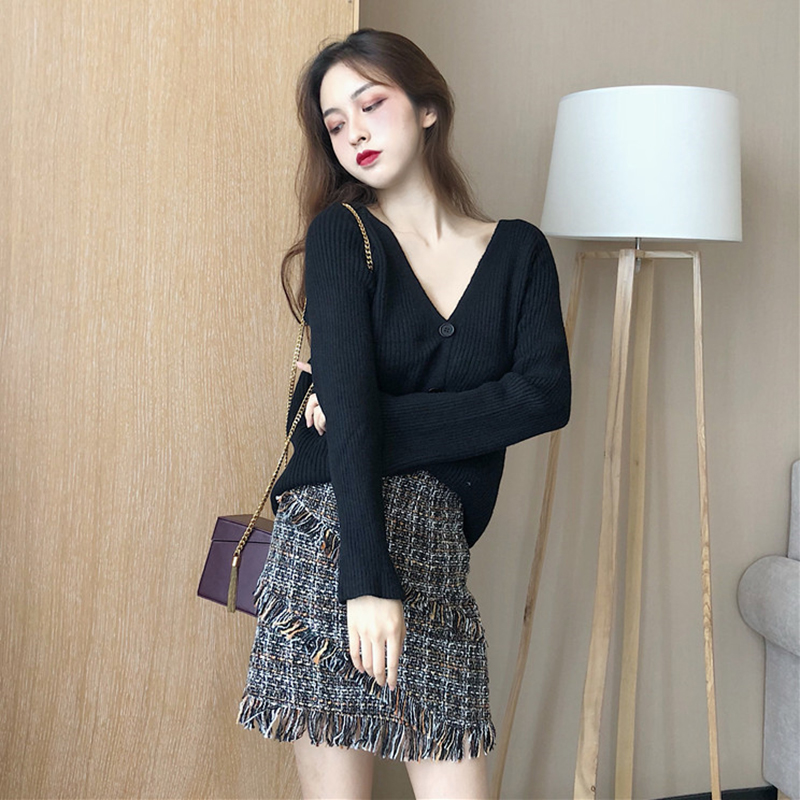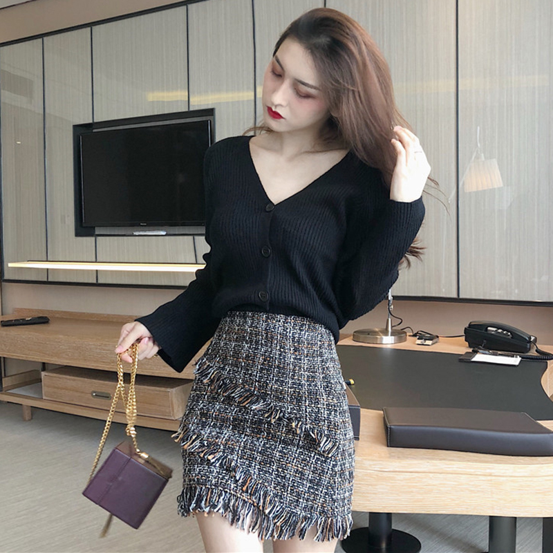 / 冷系套裝女秋新款V領喇叭袖針織毛衣開衫高腰粗花呢流蘇A字半身裙
