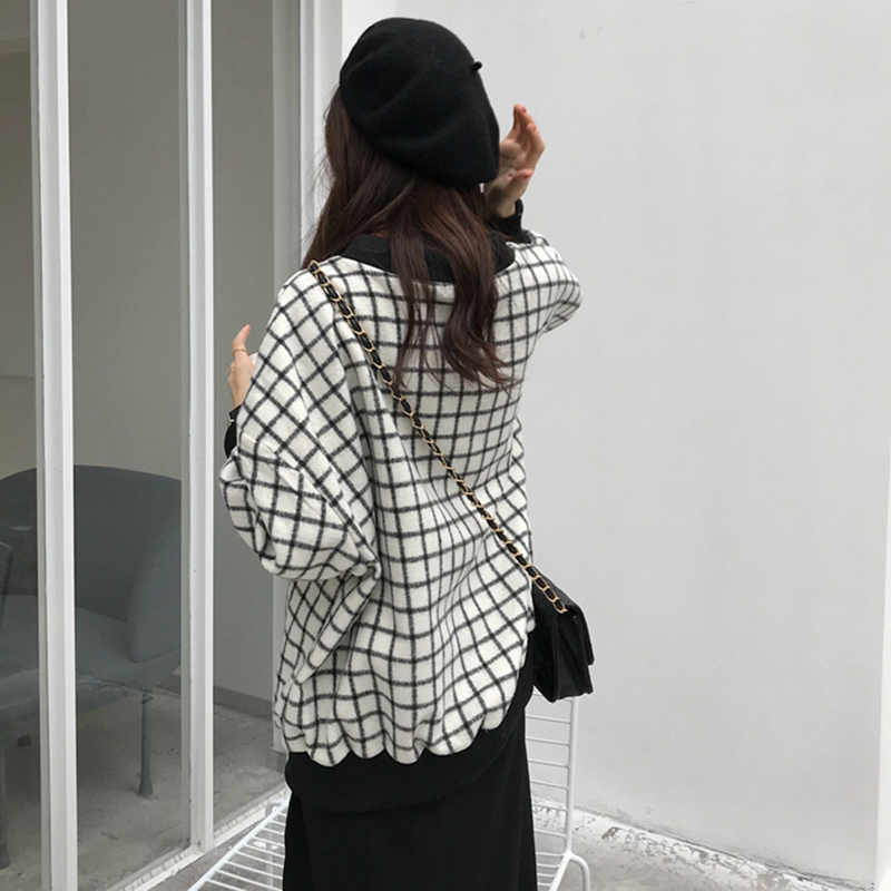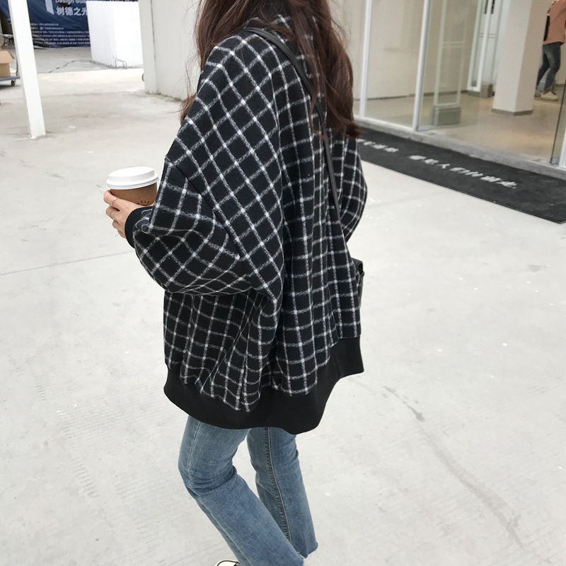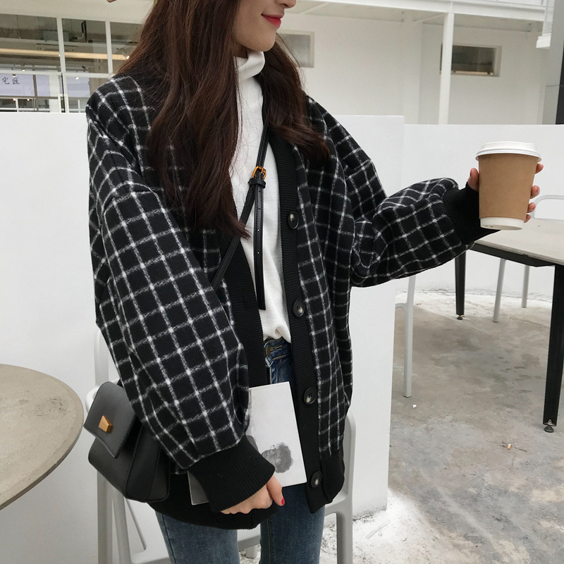學院風毛呢外套女秋冬裝2018新款韓版格子寬松V領長袖開衫上衣潮