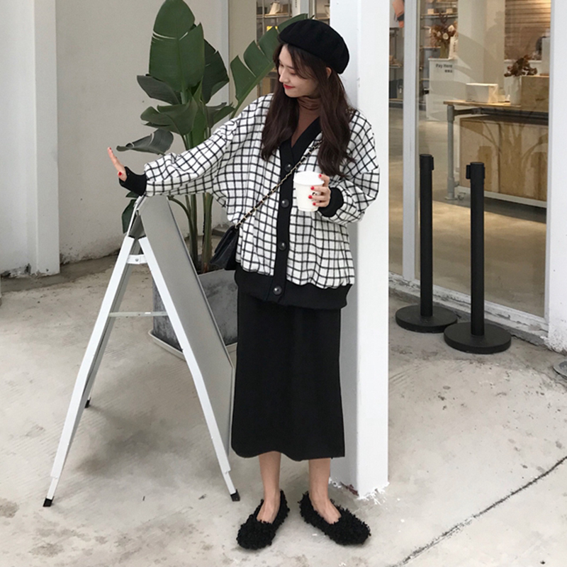 / 學院風毛呢外套女秋冬裝2018新款韓版格子寬松V領長袖開衫上衣潮
