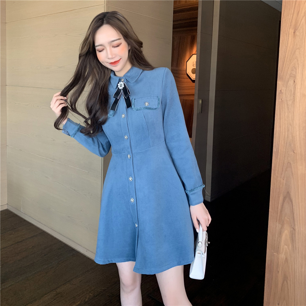 秋裝女2018新款新款復古修身顯瘦純色襯衣領燈芯絨中長款連衣裙潮