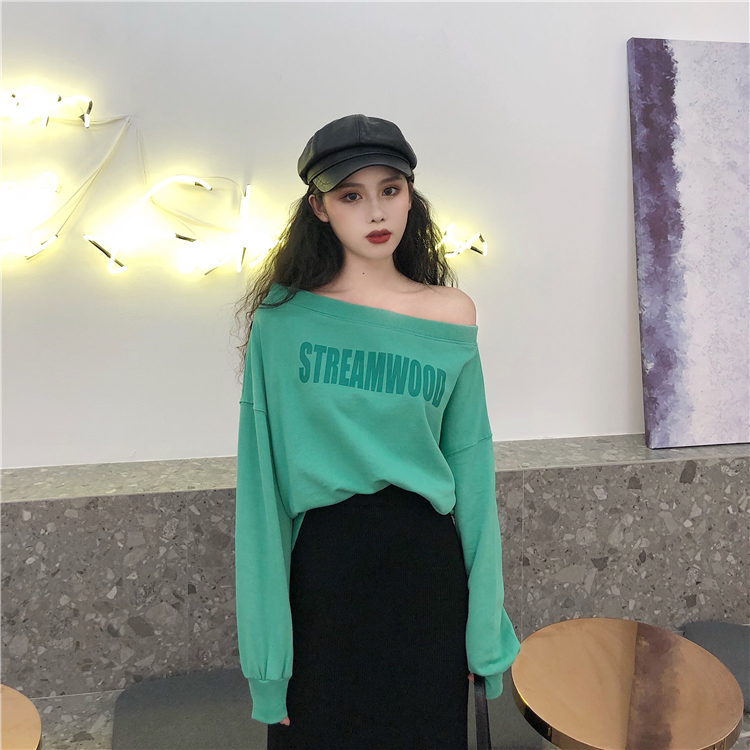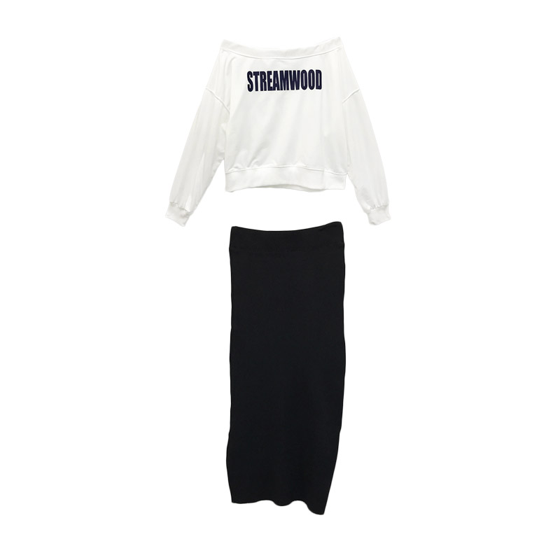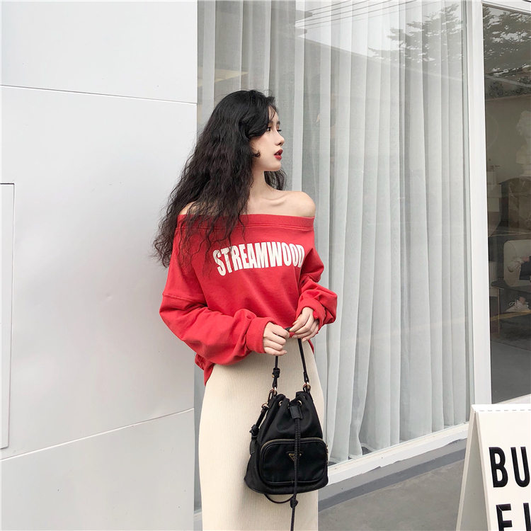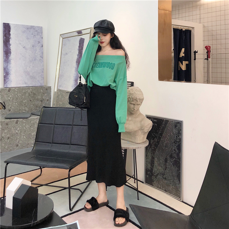 chic早秋上衣慵懶一字領漏肩衛衣+韓版高腰針織半身裙套裝分開拍