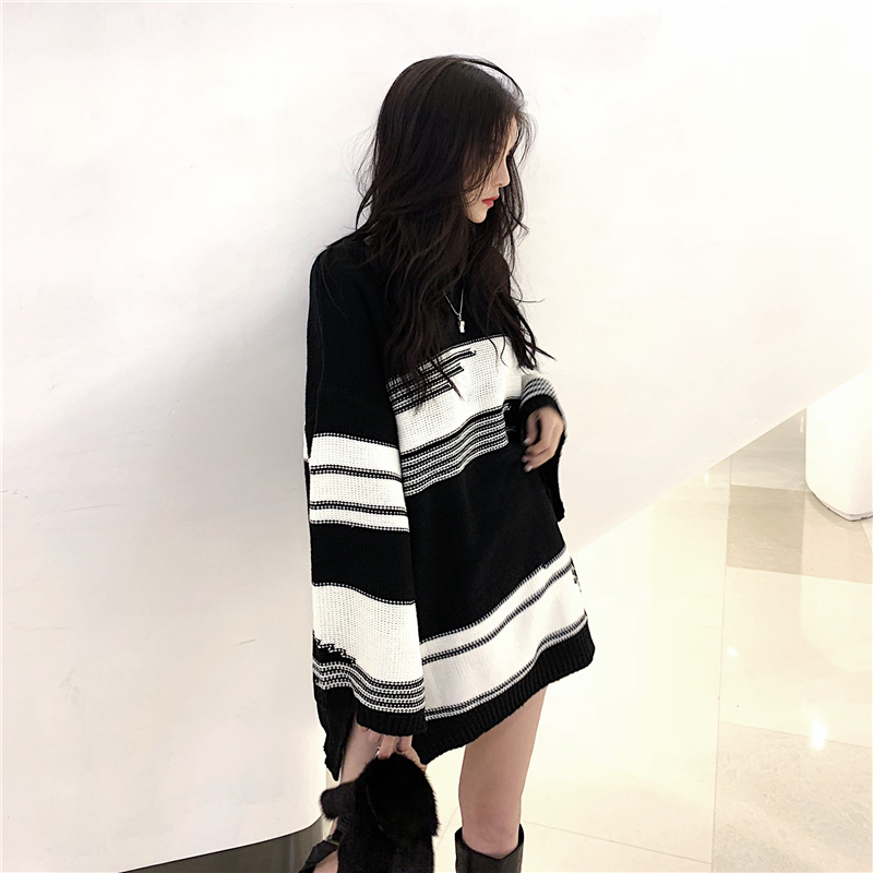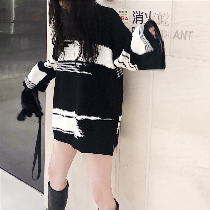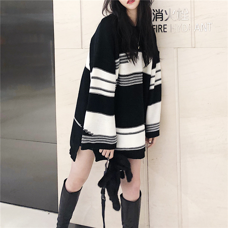 韓版網紅2018新款秋冬寬松慵懶風套頭毛衣女中長款黑白撞色上衣潮