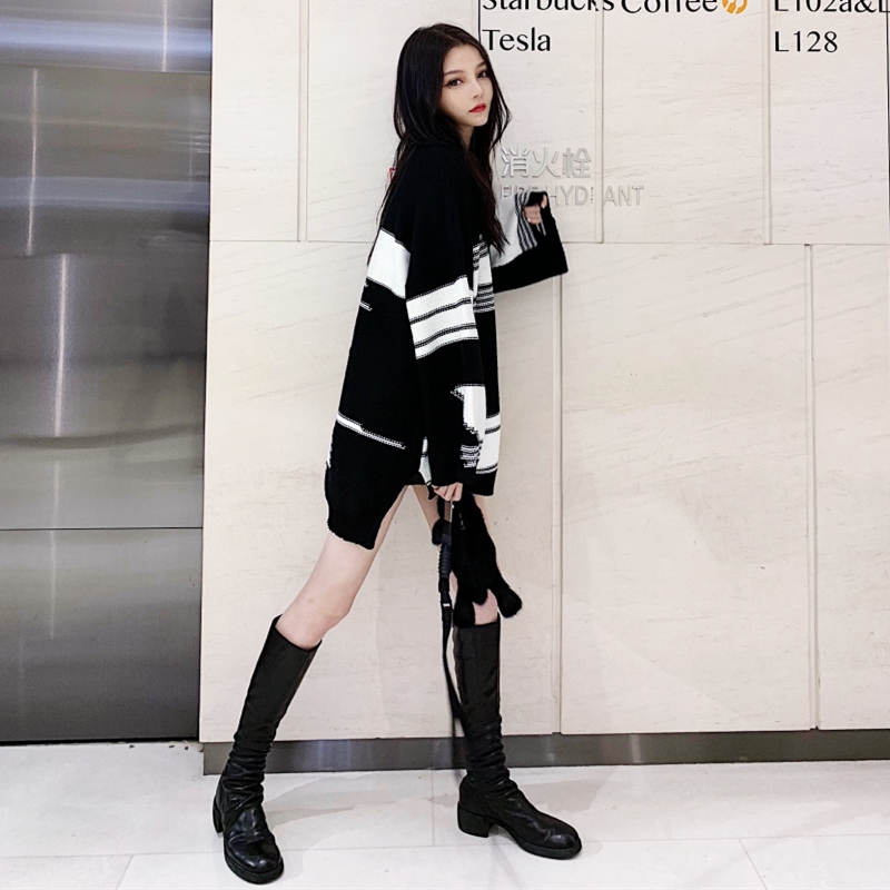 / 韓版網紅2018新款秋冬寬松慵懶風套頭毛衣女中長款黑白撞色上衣潮