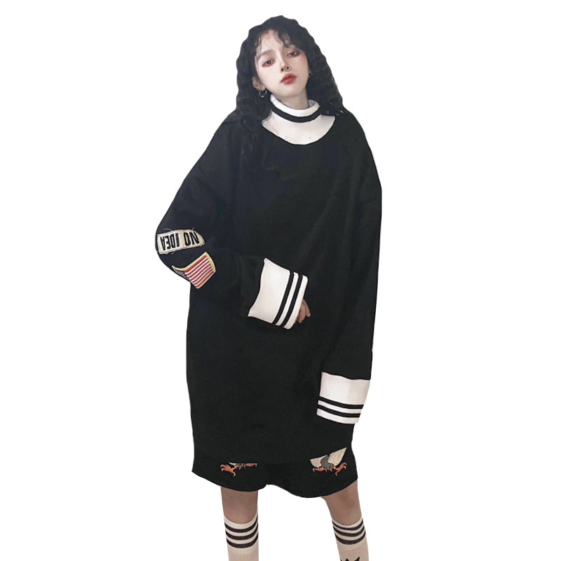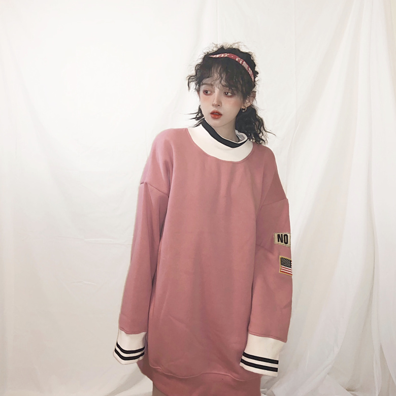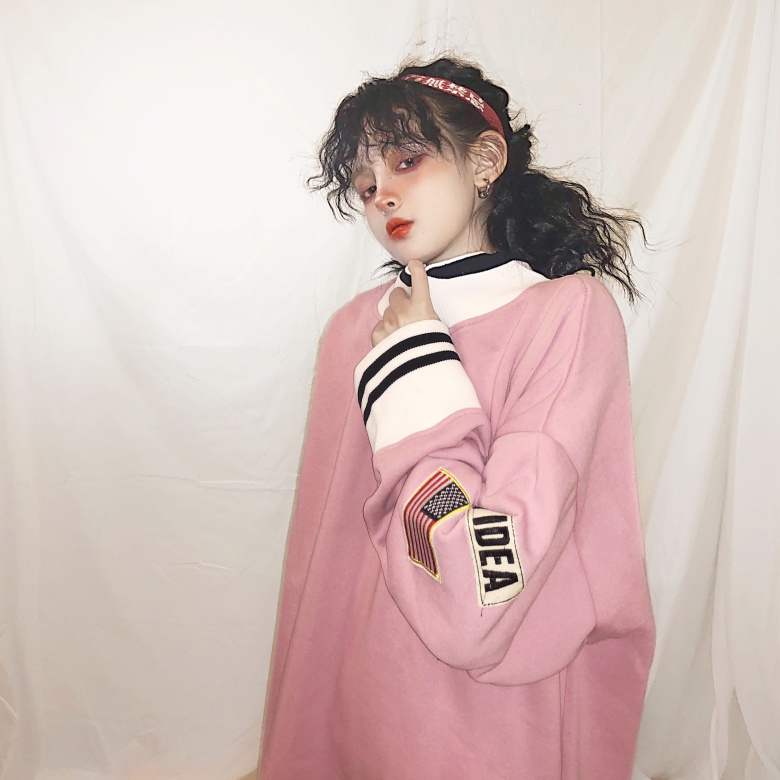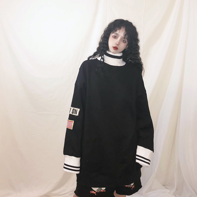 / 秋冬韓版中長款慵懶風拼接刺繡半高領加厚寬松套頭衛衣上衣外套女
