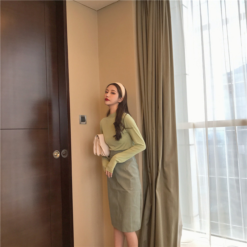 復古簡約基礎立領T恤高腰顯瘦中長款半身皮裙時尚套裝兩件套女潮
