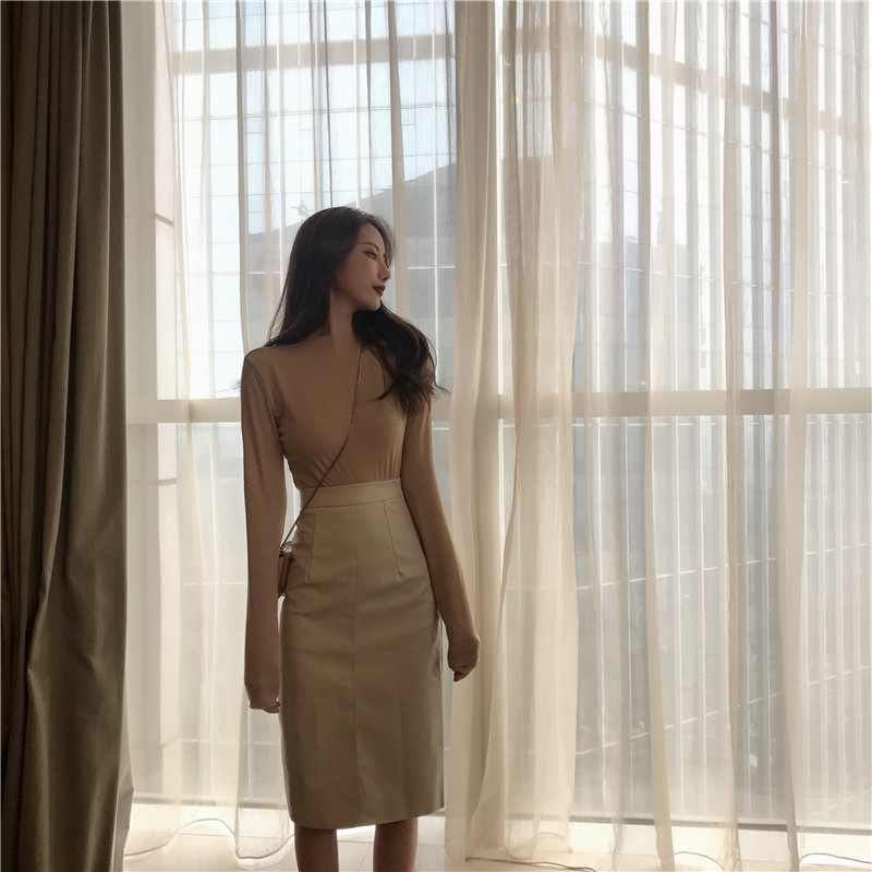 / 復古簡約基礎立領T恤高腰顯瘦中長款半身皮裙時尚套裝兩件套女潮