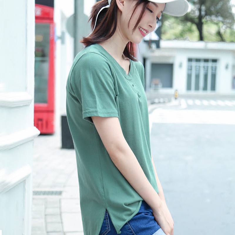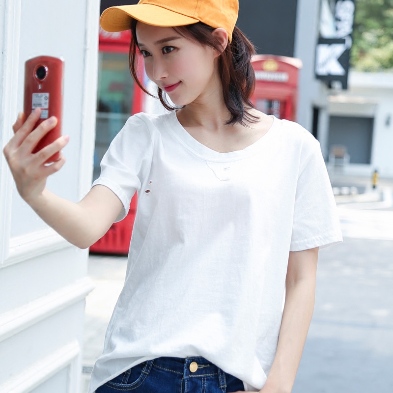 新款純棉短袖T恤女夏寬松顯瘦韓版圓領破洞休閑上衣體恤衫