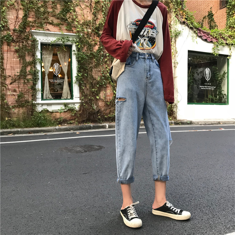 / 秋裝女裝韓版寬松百搭水洗哈倫褲牛仔褲高腰顯瘦破洞直筒褲九分褲