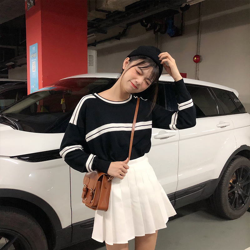 秋季女裝韓版學院風長袖套頭針織衫學生寬松百搭條紋顯瘦毛衣上衣