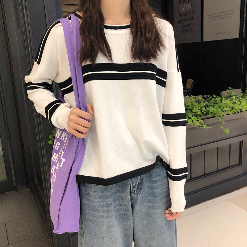 / 秋季女裝韓版學院風長袖套頭針織衫學生寬松百搭條紋顯瘦毛衣上衣