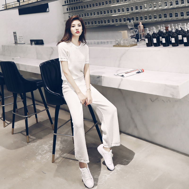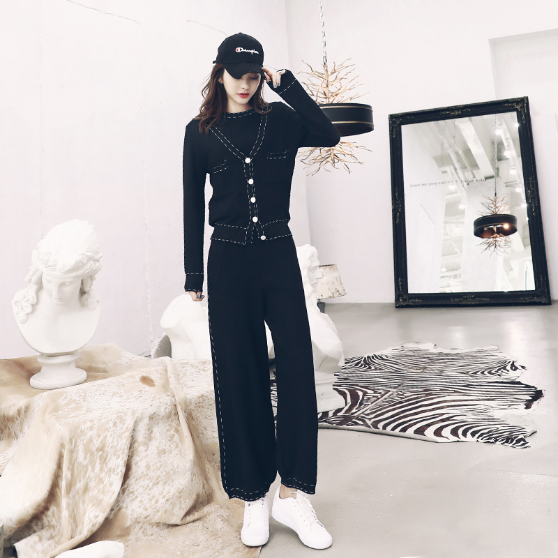 / 名媛闊腿褲套裝女韓版休閑短袖T恤上衣長袖針織開衫三件套春秋