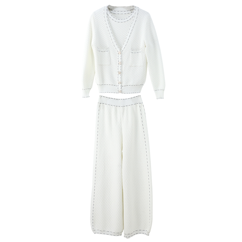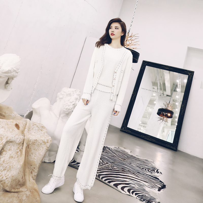 名媛闊腿褲套裝女韓版休閑短袖T恤上衣長袖針織開衫三件套春秋