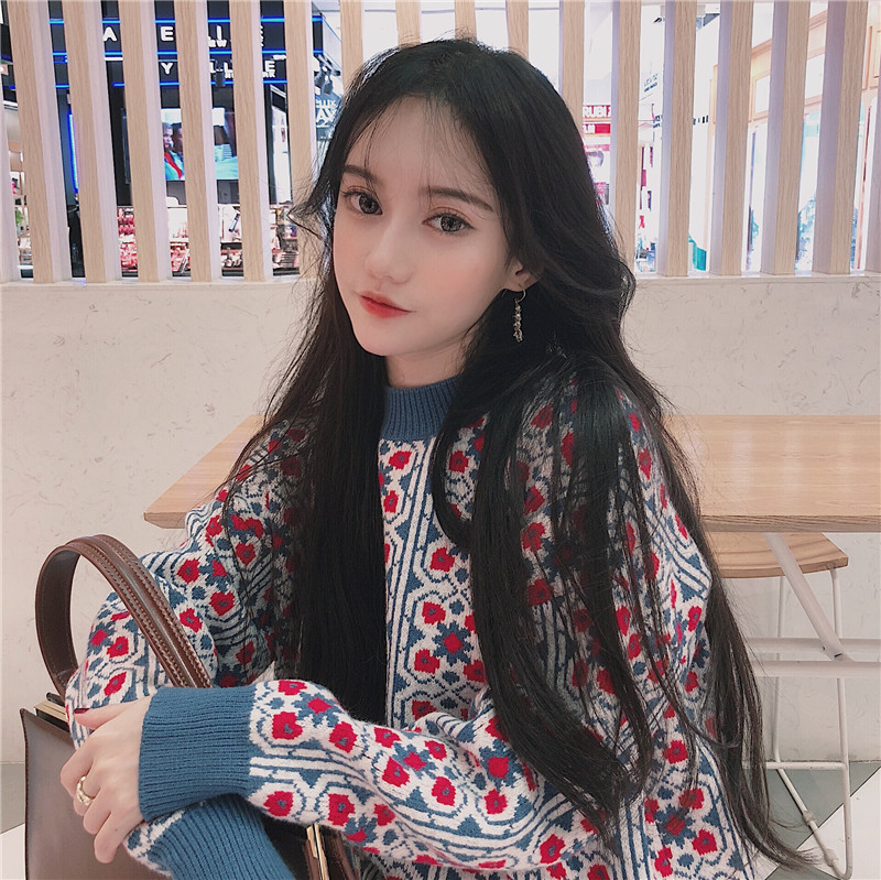 2018秋冬新款時尚chic溫柔風花花毛衣女套頭寬松懶惰圓領毛線衣女