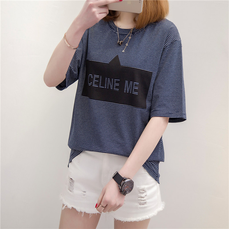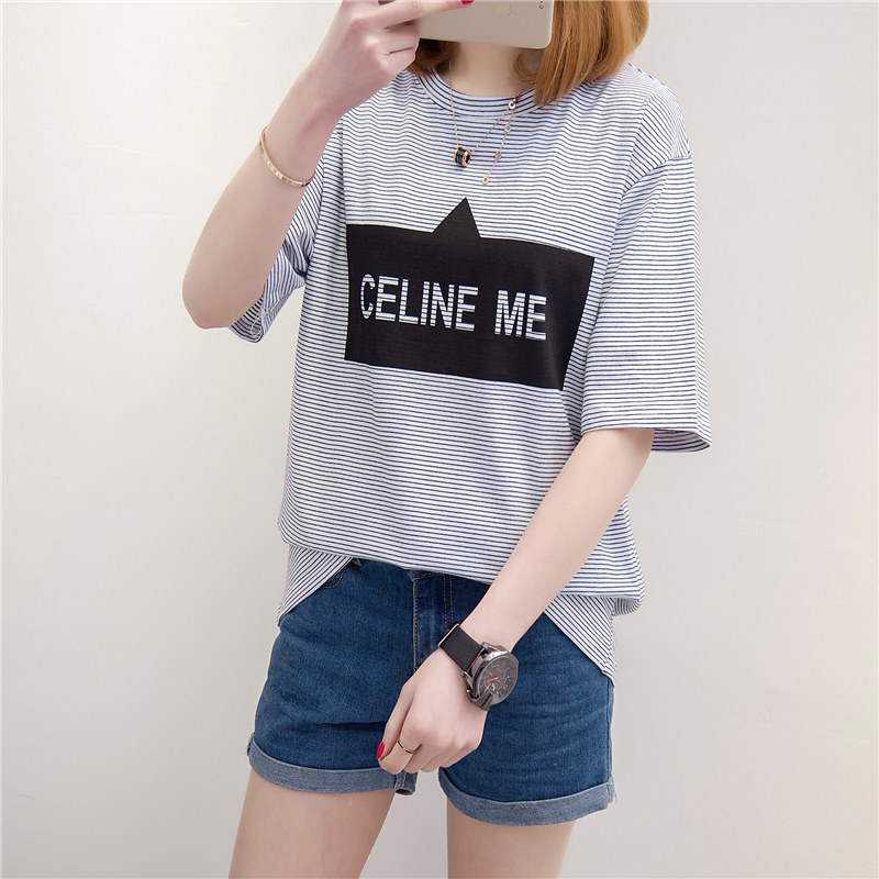 / 條紋t恤女短袖上衣女夏新款潮字母體恤女春裝韓版打底衫百搭
