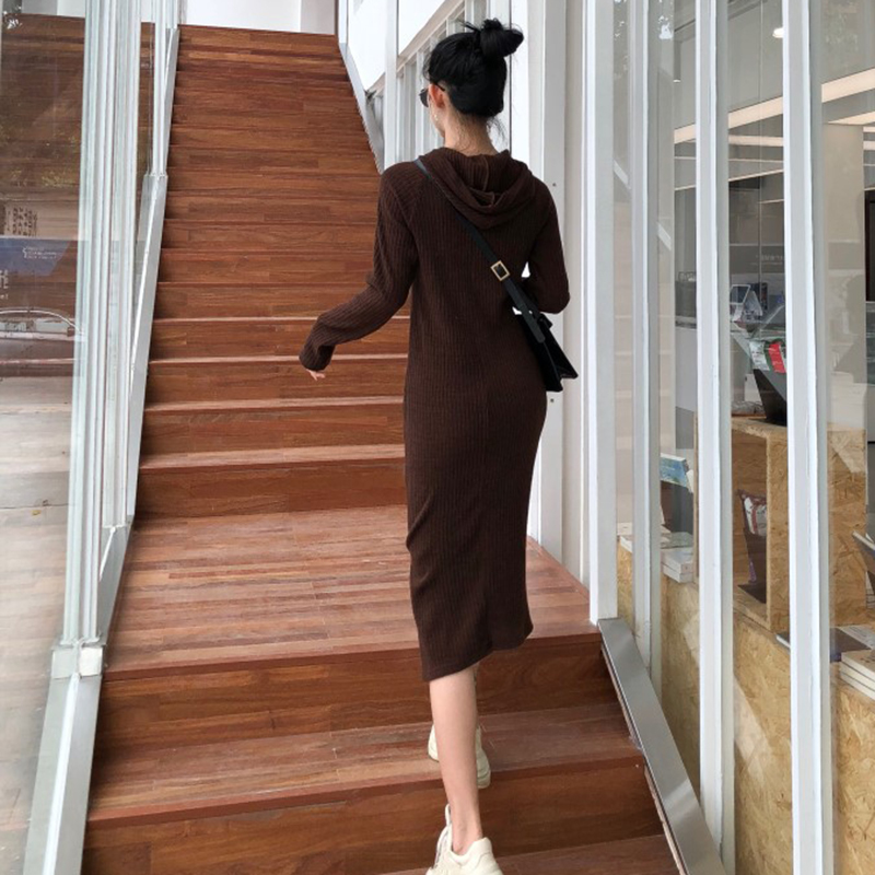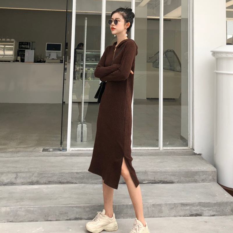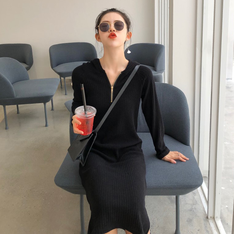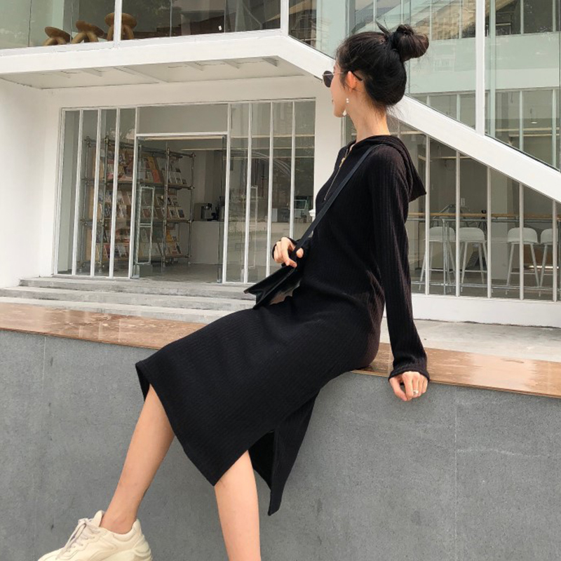 秋裝女2018新款韓版連帽長袖黑色顯瘦中長裙子個性時尚開叉連衣裙
