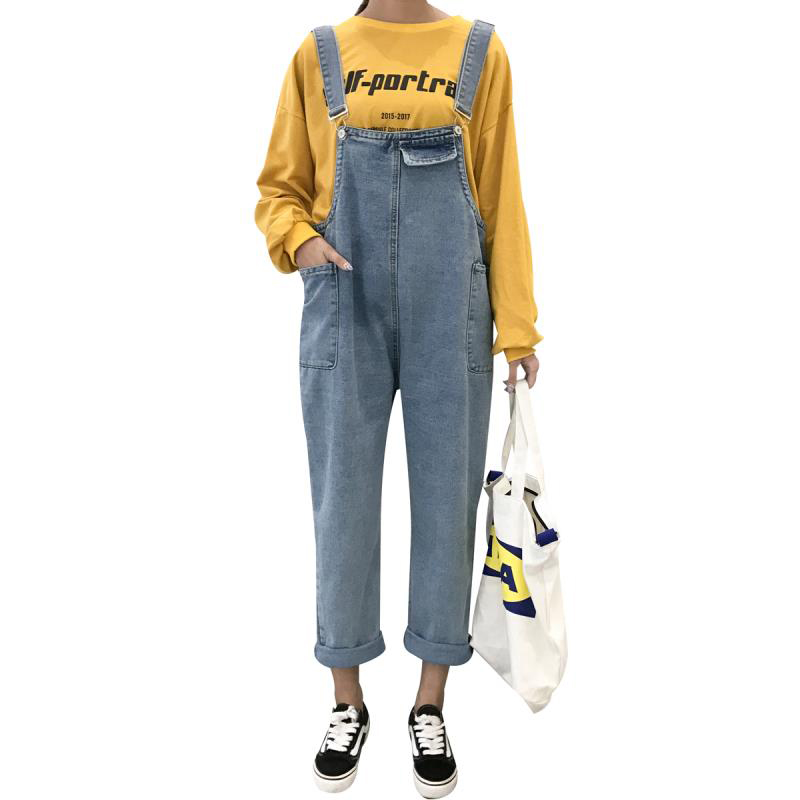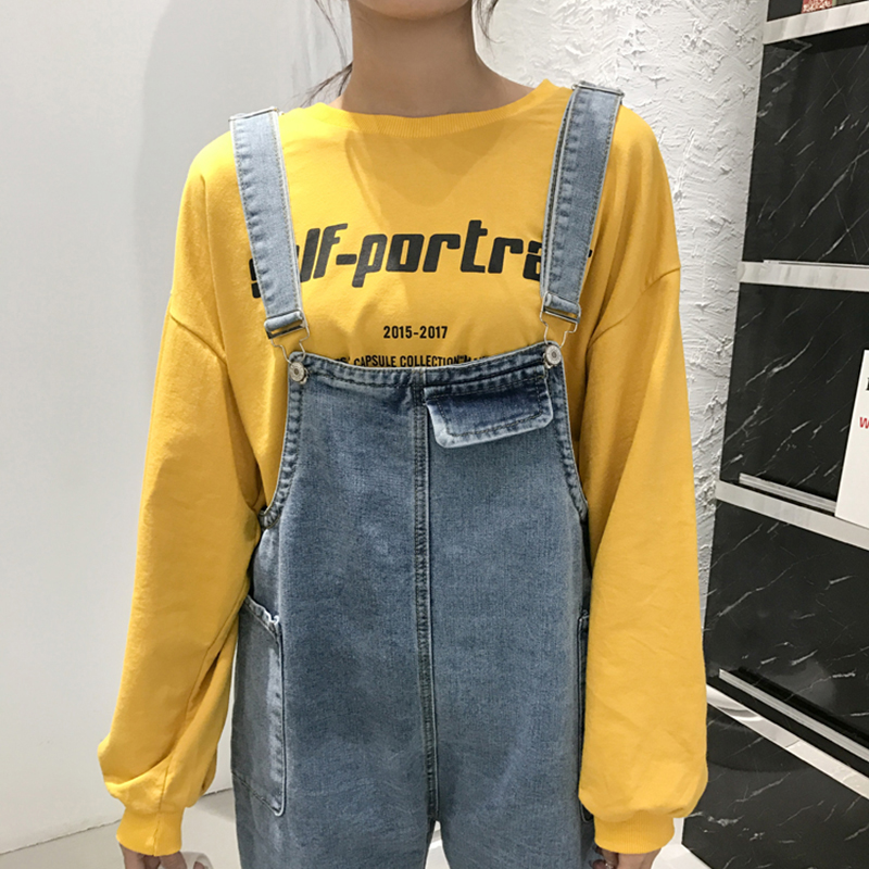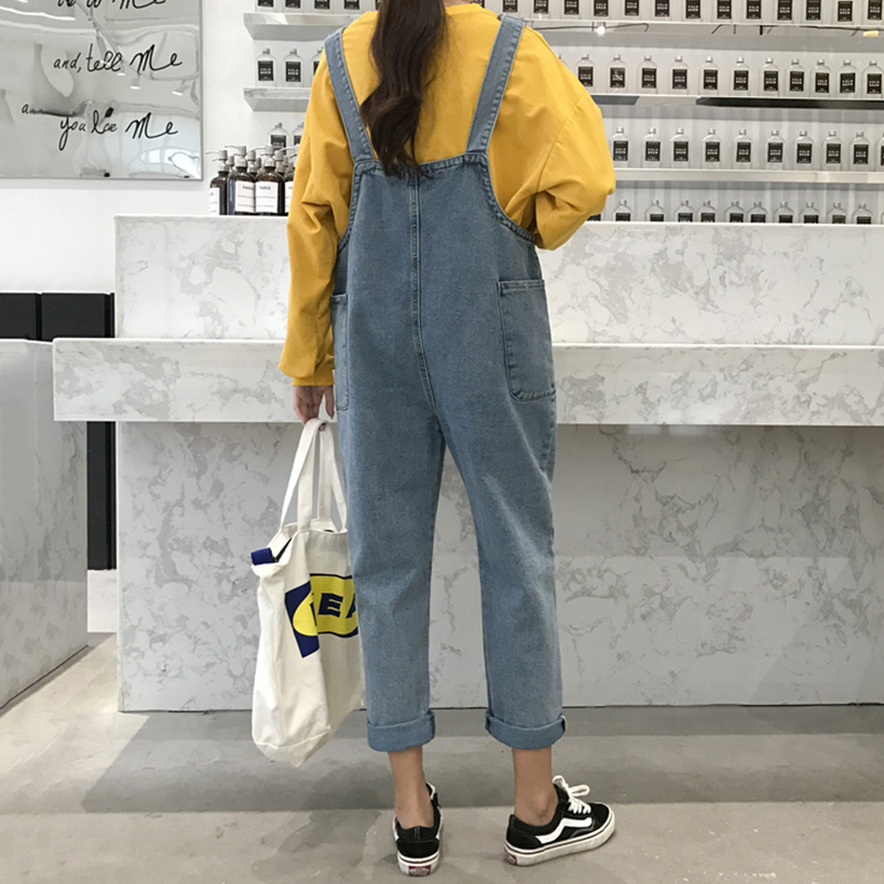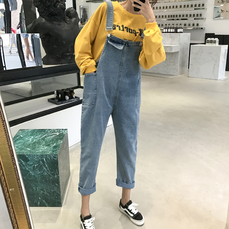 復古風工裝背帶褲秋裝女2018新款寬松卷邊牛仔褲百搭學生休閑褲子